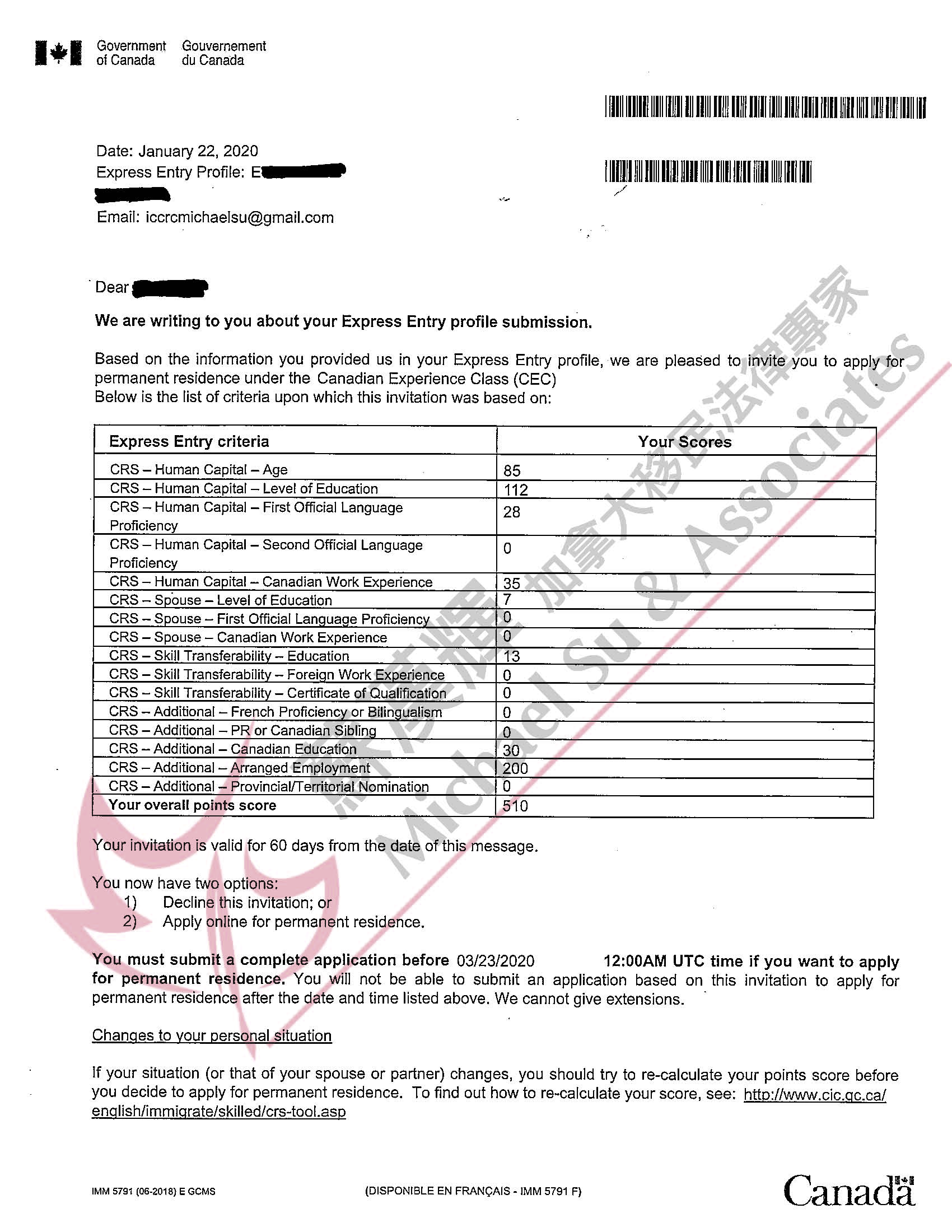 2) 510:两年 College Diploma,一年加拿大工作经验,LMIA 加 200 分