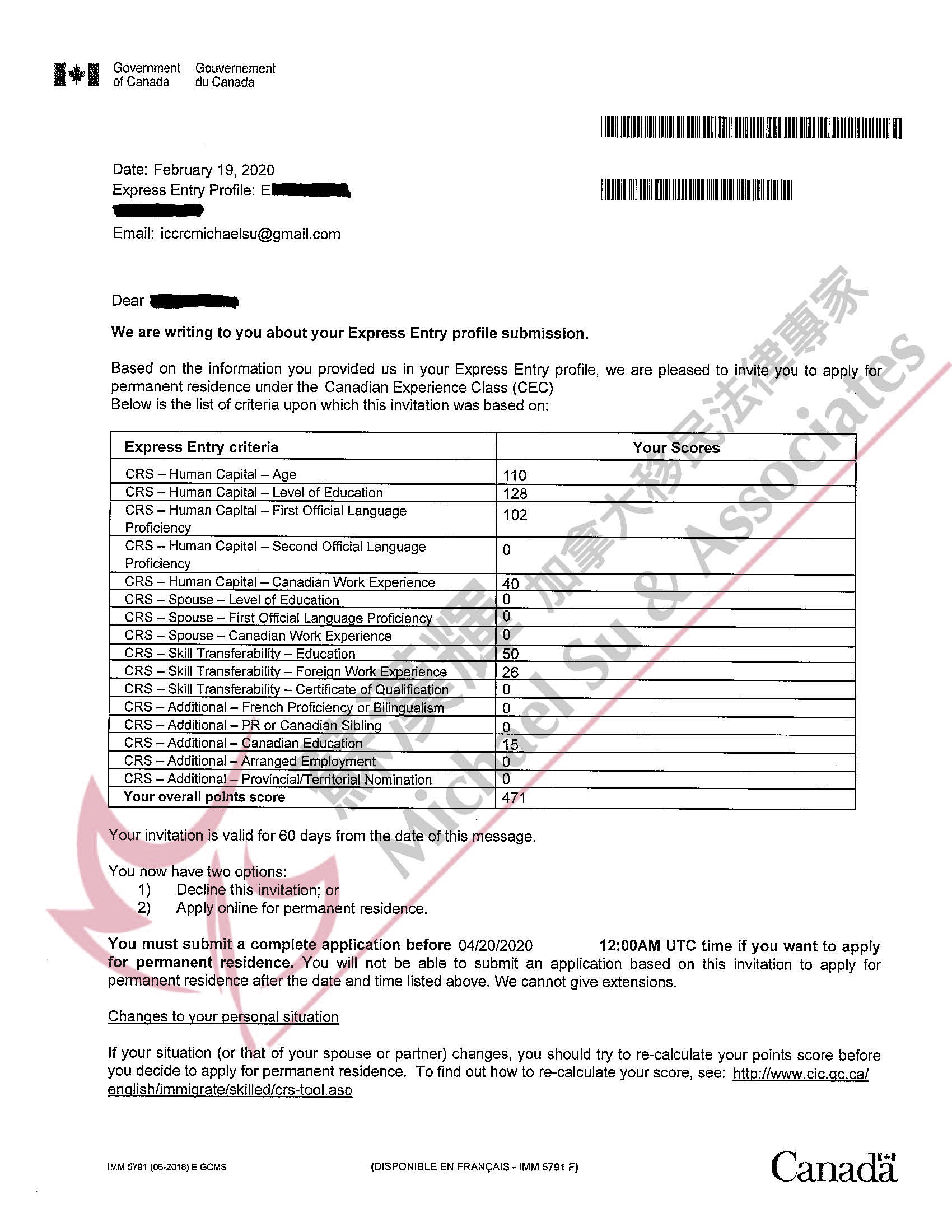 2. 有加拿大学历,加拿大工作经验和中国工作经验,得到 471 分