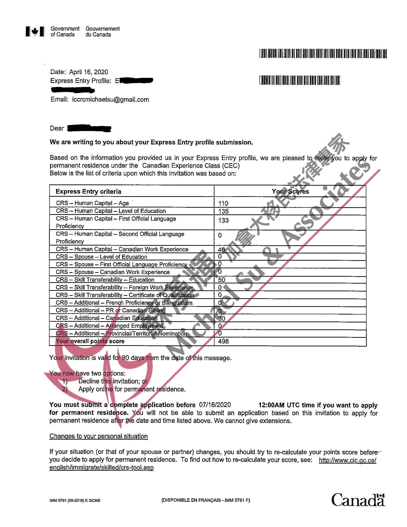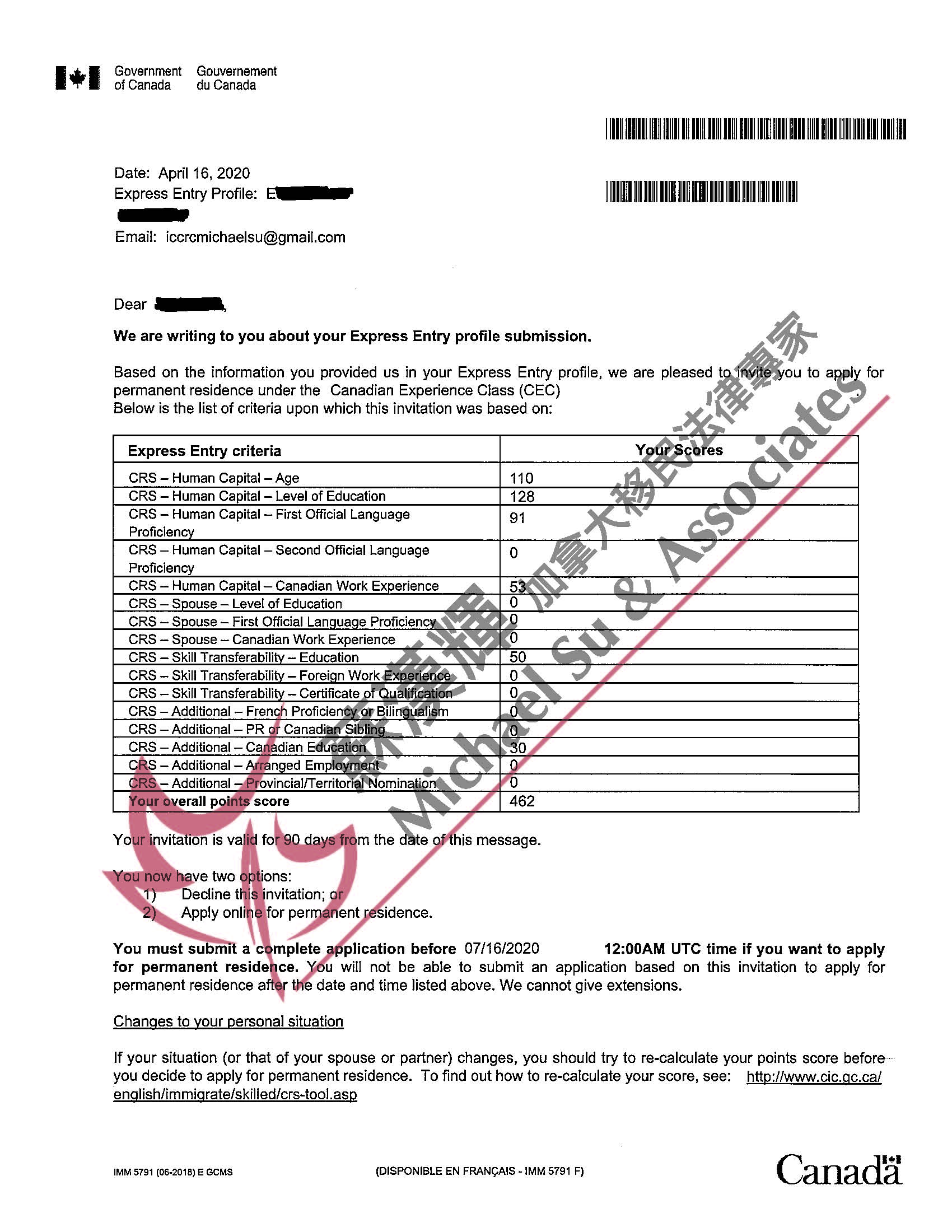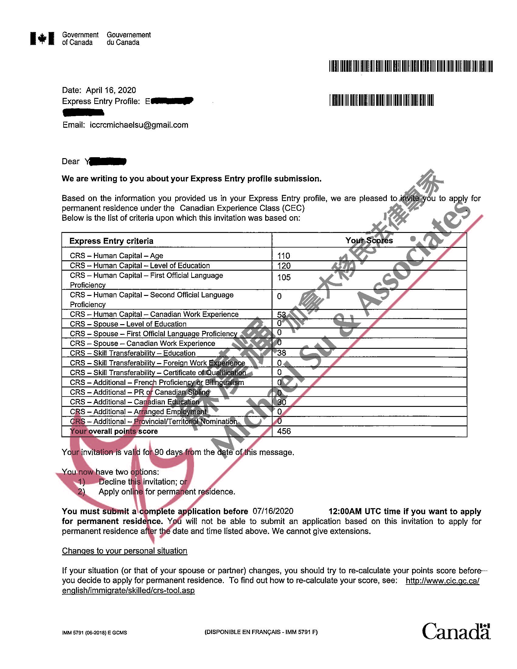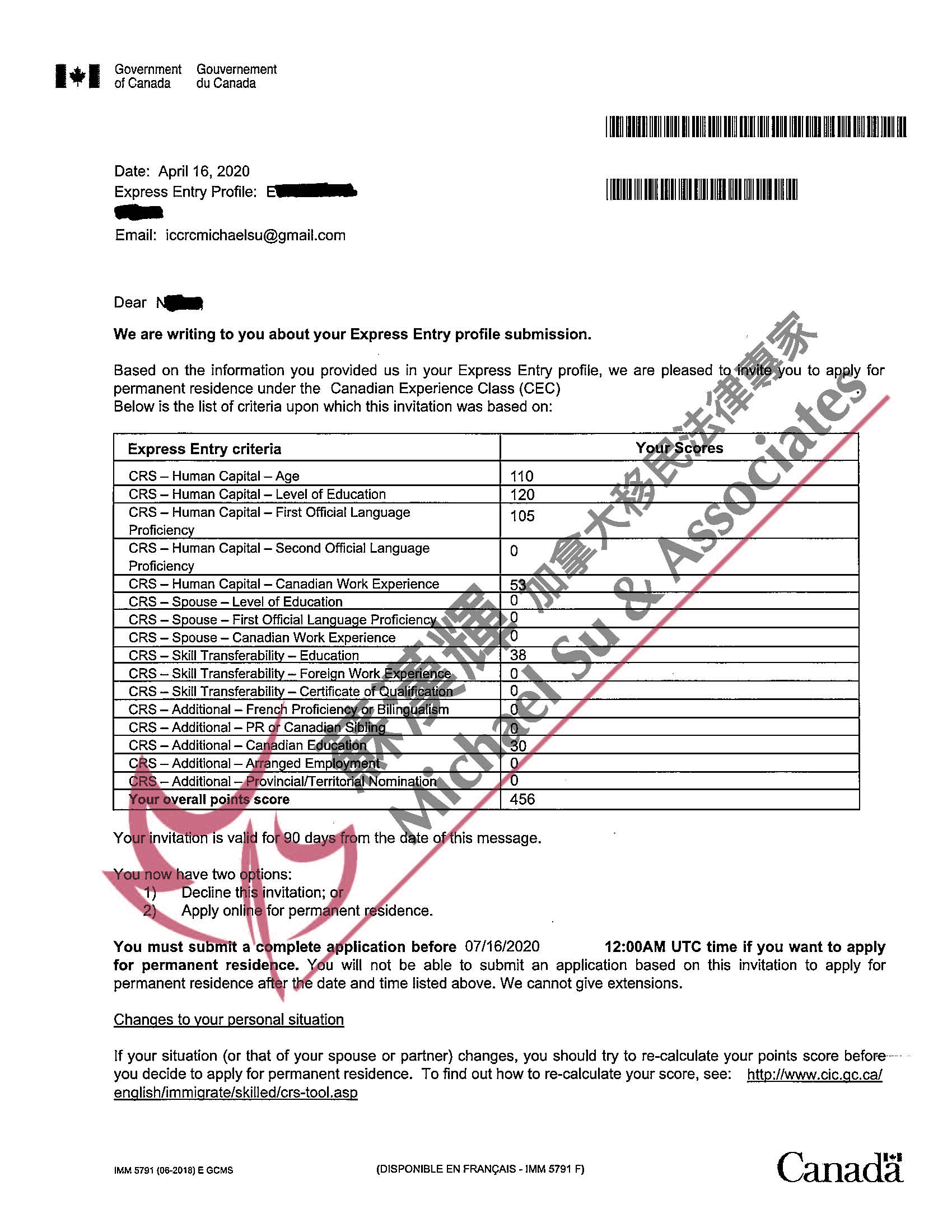 2020 年 4 月 16 日 EE 八人抽中,本期 EE 分数 455 分,只限于加拿大境内工作经验的申请人,以下为各申请人的情况: