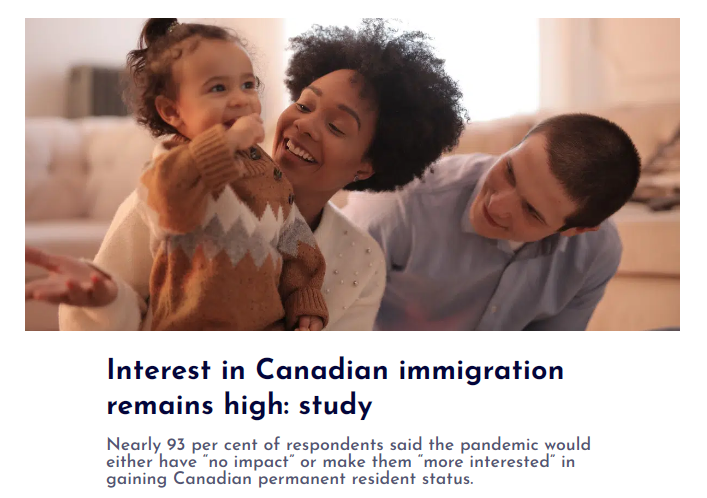 一项针对13000多名潜在移民的调查显示,移民加拿大的兴趣依然强烈。WES报告称,近52%的受访者表示,新冠疫情不会对他们的移民计划产生影响。近93%的人表示要么“没有影响”,要么会让他们“更感兴趣”。
