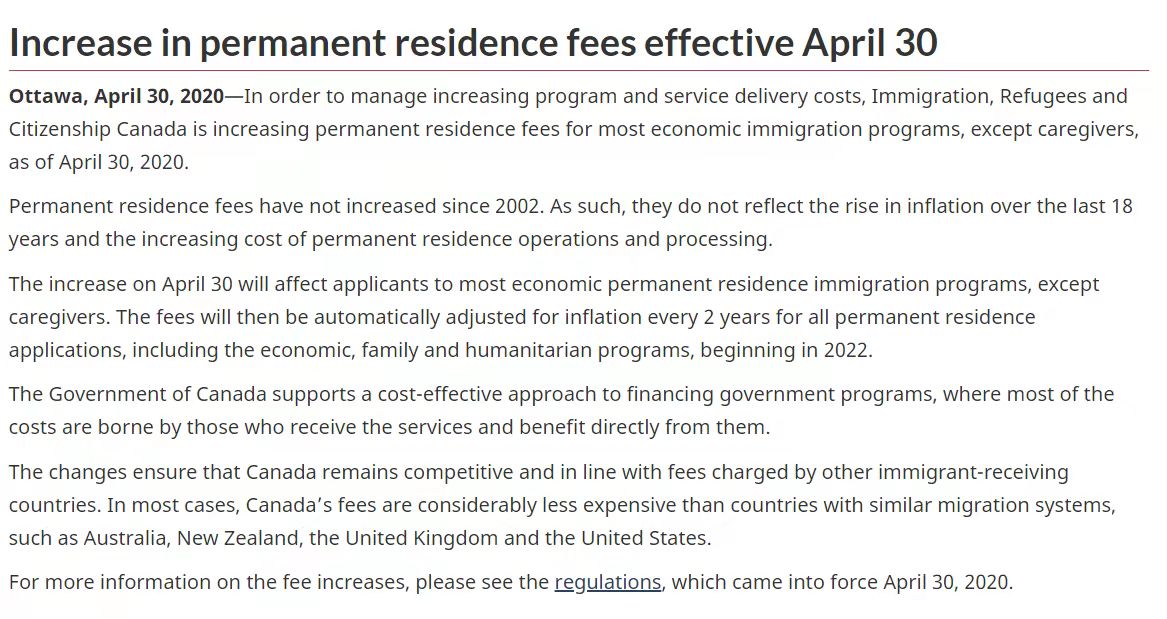 由于不断増加的项目和服务成本,加拿大移民部从2020年4月就在提高大多数移民项目的永久居留费用。永久居留费2002年以来一直没有增长,是因为没有考虑过去18年来通货膨胀的上升以及永久居留业务和办理费用的増加。